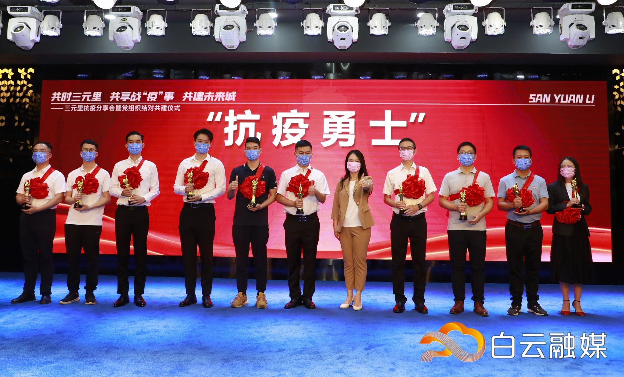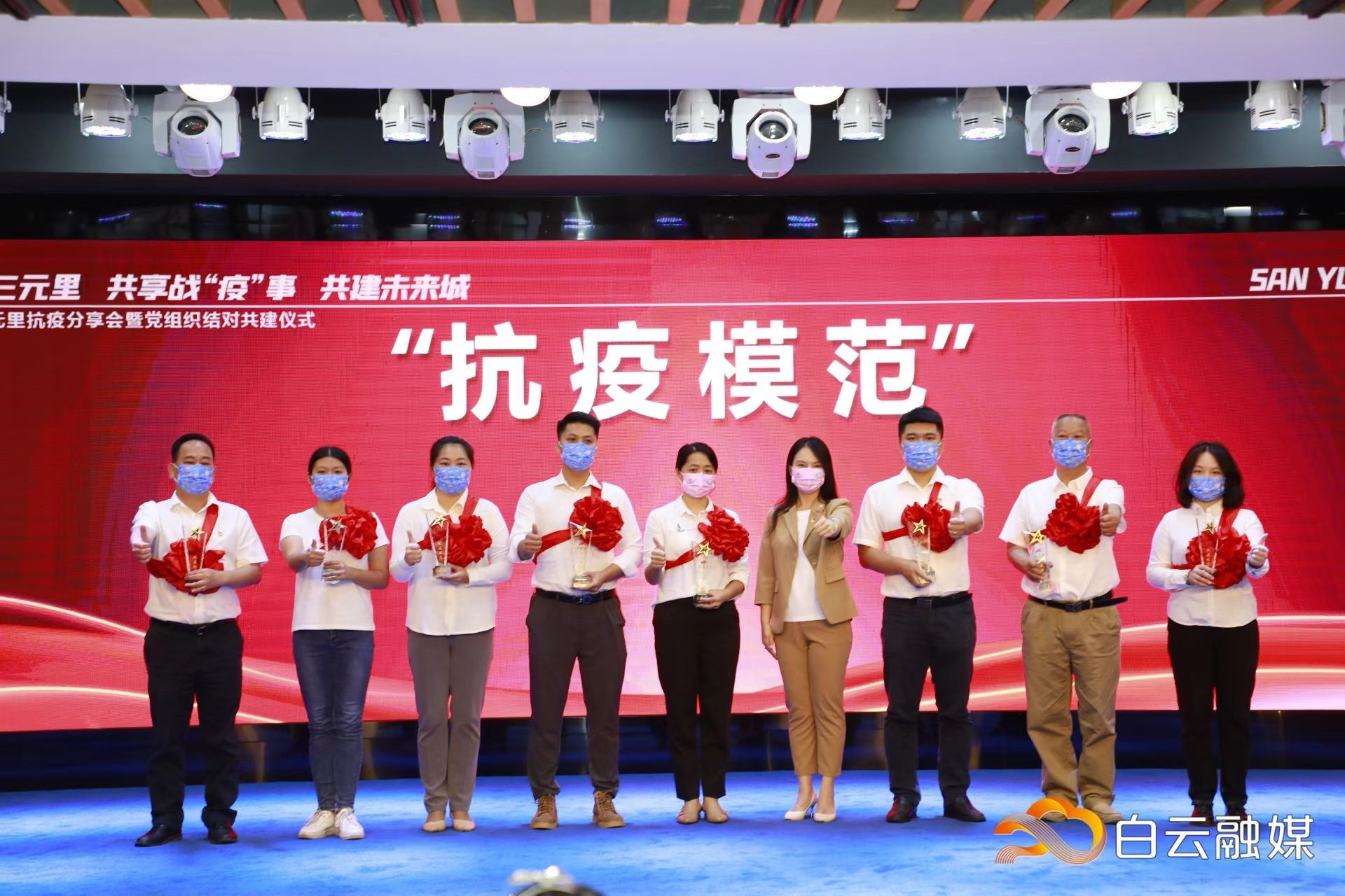 5月20日,三元里街举行战“疫”分享会暨党组织结对共建仪式,表彰了一批抗疫模范、抗疫勇士等,街道及社区工作人员、医务人员、志愿者等代表分享了他们坚守防疫一线的故事。现场,三元里街辖内7个党组织结对共建,旨在实现优势互补,促进党建与业务“双提升”。