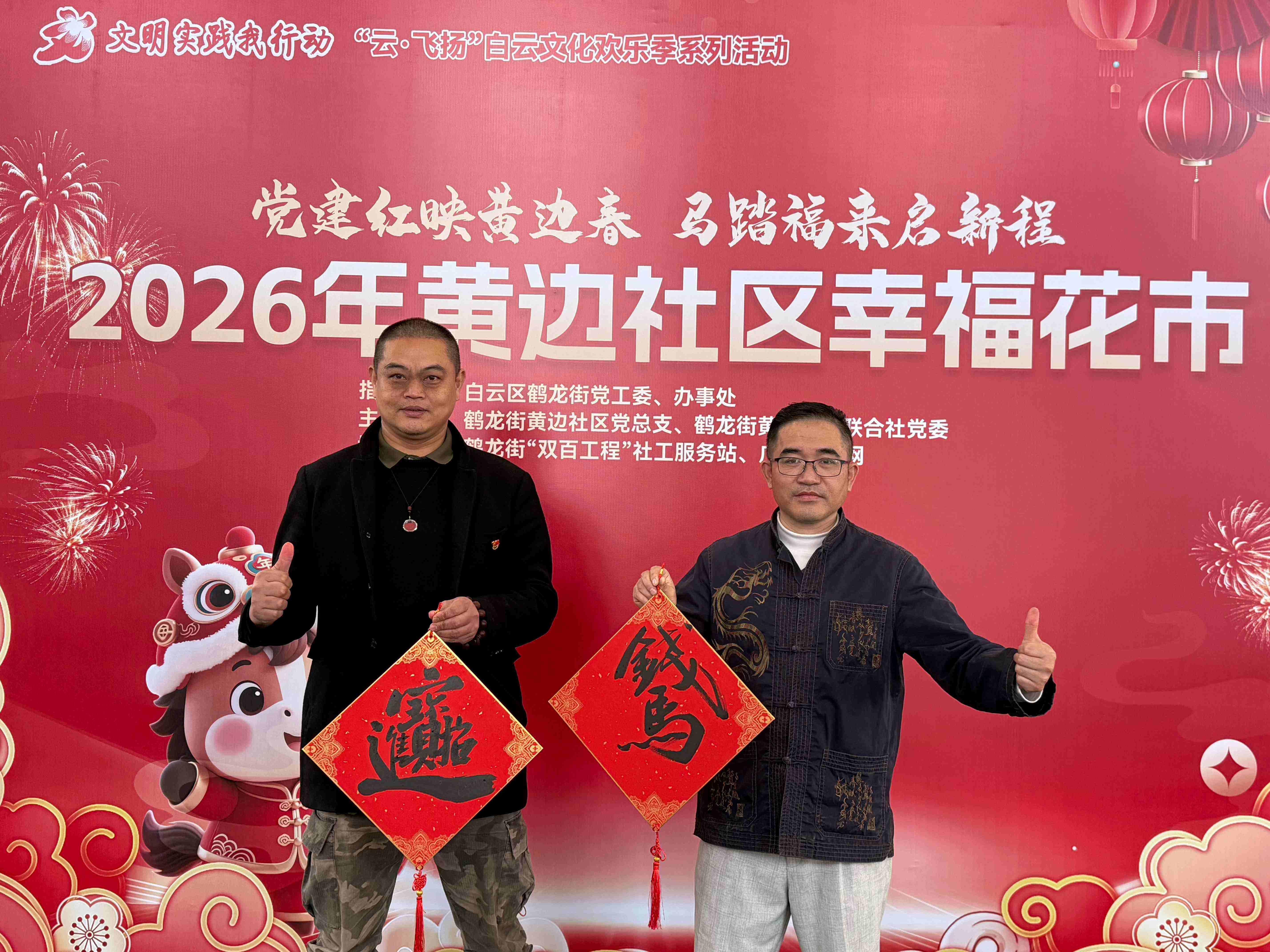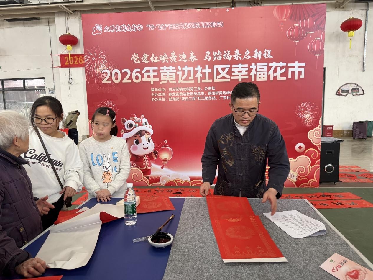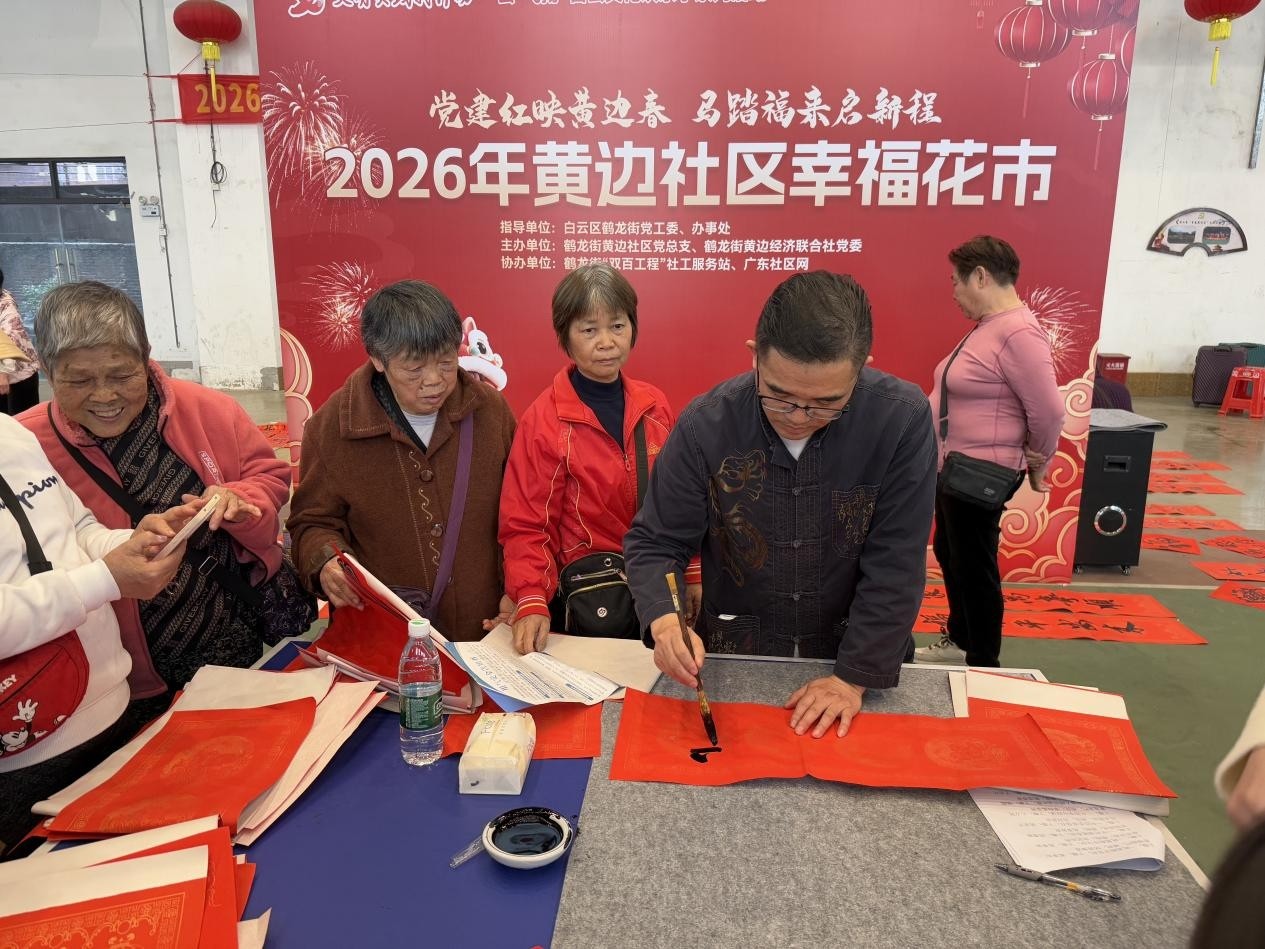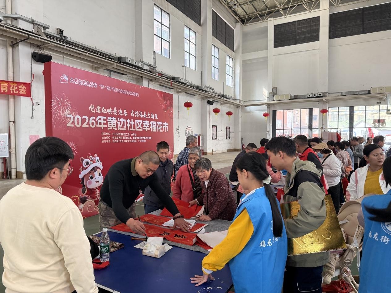 龙辞旧岁启新章,马踏春来福满堂。为深入贯彻落实新时代党的文化建设要求,充分发挥党建引领基层治理效能,丰富社区居民精神文化生活,传承弘扬中华优秀传统文化,1月29日,由白云区鹤龙街党工委、办事处指导,鹤龙街黄边社区党总支、鹤龙街黄边经济联合社党委主办,鹤龙街“双百工程”社工服务站、广东社区网协办的“党建红映黄边春,马踏福来启新程”2026年黄边社区幸福花市在社区文体康乐馆热闹开锣。活动以“党建+民俗”为核心载体,将红色基因融入传统年味,吸引了社区数百名居民踊跃参与,现场墨香四溢、笑语盈盈,一派喜乐融融的新春景象。