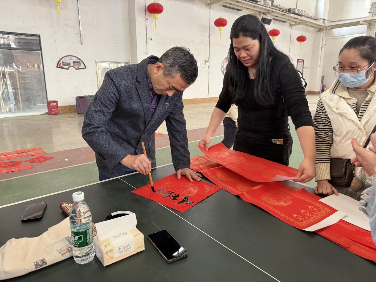 “老师,麻烦帮我写一副‘龙去雄风在,马来福气生’的春联!”“我想要个篆书的福字,贴在家里特别有意义!”在迎新挥春区域,几位书法老师正凝神挥毫,毛笔在宣纸上笔走龙蛇,一幅幅笔力遒劲的春联、一个个寓意吉祥的“福”字很快便新鲜“出炉”。墨香袅袅中,居民们有序排队,或挑选预设的经典春联内容,或现场定制专属新春寄语,书法老师们耐心询问大家的需求,时而提笔疾书,时而细致调整,力求将最好的新春祝福融入笔墨之中。拿到春联的居民们喜不自胜,有的当场展开欣赏,互相品评字迹韵味;有的小心翼翼地将春联叠好,生怕损坏了这份珍贵的新春礼物。“每年都盼着社区的挥春活动,手写的春联才有过年的味道!”家住黄边社区的李阿姨拿着刚写好的春联,脸上满是喜悦,“今年的春联不仅字体好看,还带着浓浓的党建温暖,贴在家里既喜庆又有意义。”