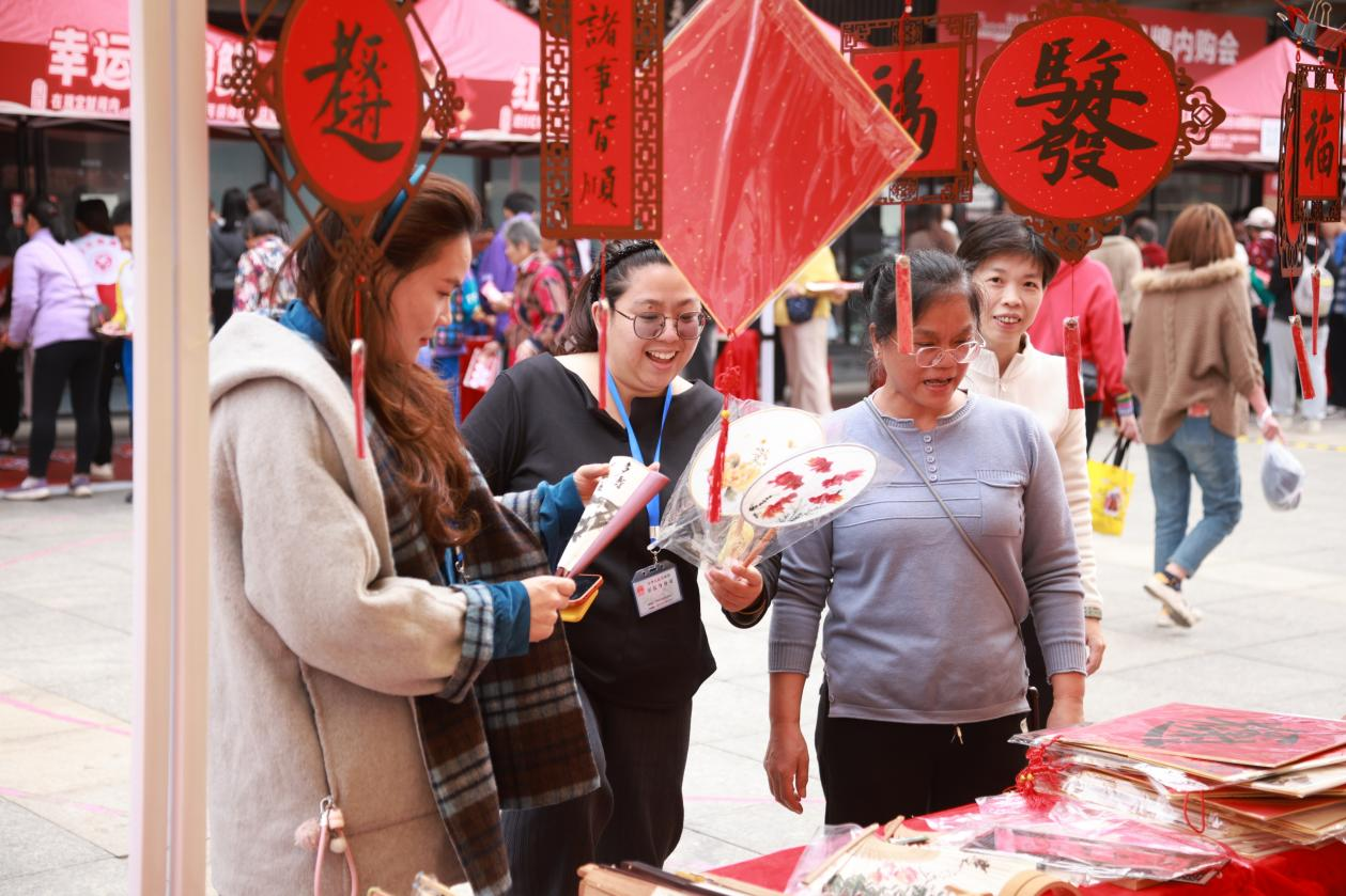 笔墨传情送祝福,民俗喜乐润人心。活动邀请白云区书法家协会副主席朱盛新、程磊、涂林聪,白云区书法家协会副秘书长肖建富等4位知名书法家现场挥毫,一幅幅饱含吉祥寓意的挥春,承载着新春期许送到居民手中,笔墨飘香间,满是邻里相聚的欢喜,也让中华传统文化在欢乐氛围中得以传承。迎春游园会更是欢乐爆棚,5大互动游戏前人头攒动,灯谜问答的思索、红包拓印的欢喜、投壶纳福的雀跃、钓锦鲤的期待、福气套圈的欢呼,交织成最动听的新春乐章;12个服务摊位各具风采,街道多部门、医疗机构、社会组织等多方联动,既带来工会法律服务咨询、紧急救护、消防安全、工伤预防、平安法治等便民科普,也通过非遗广绣、漆扇制作、糖画展演等形式,让居民在动手体验、观赏品鉴中,近距离感受传统民俗魅力,收获满满的欢乐与惊喜。