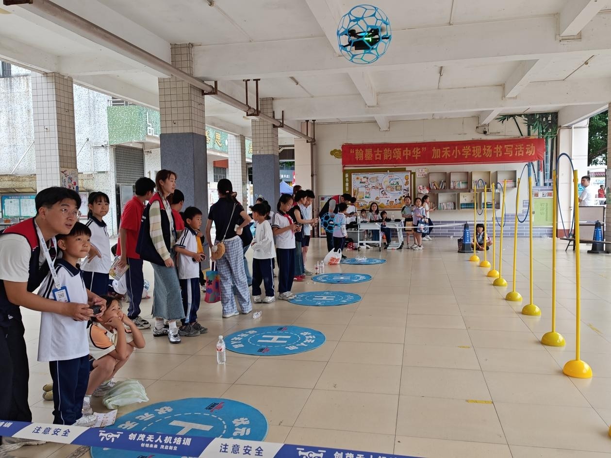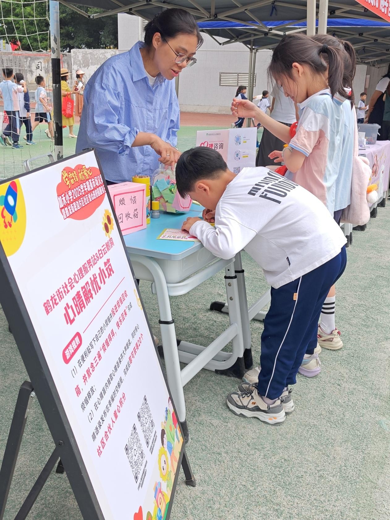 社区合伙人打造的各类打卡摊位,在志愿服务力量的助力下成为现场焦点。鹤龙街“双百工程”社工服务站摊位前,志愿者与工作人员协同配合,耐心指导同学们邀请家长注册“云芳邻”小程序、加入鹤龙亲子趣学营或鹤龙幸福搭子俱乐部,既让同学们轻松获得积分,也推动“云芳邻”社区基层治理平台深入校园与家庭,实现“指尖办服务、邻里心相融”。东莞银行点钞小能手PK赛、亲子智飞无人机锦标营、鹤龙街社会心理服务站互动体验等摊位,均在志愿者的协助下有序开展,孩子们在趣味比拼中学习知识、提升能力、释放学习压力和烦恼,活动部分收益还将反哺社区慈善基金,实现公益与体验的双向赋能。