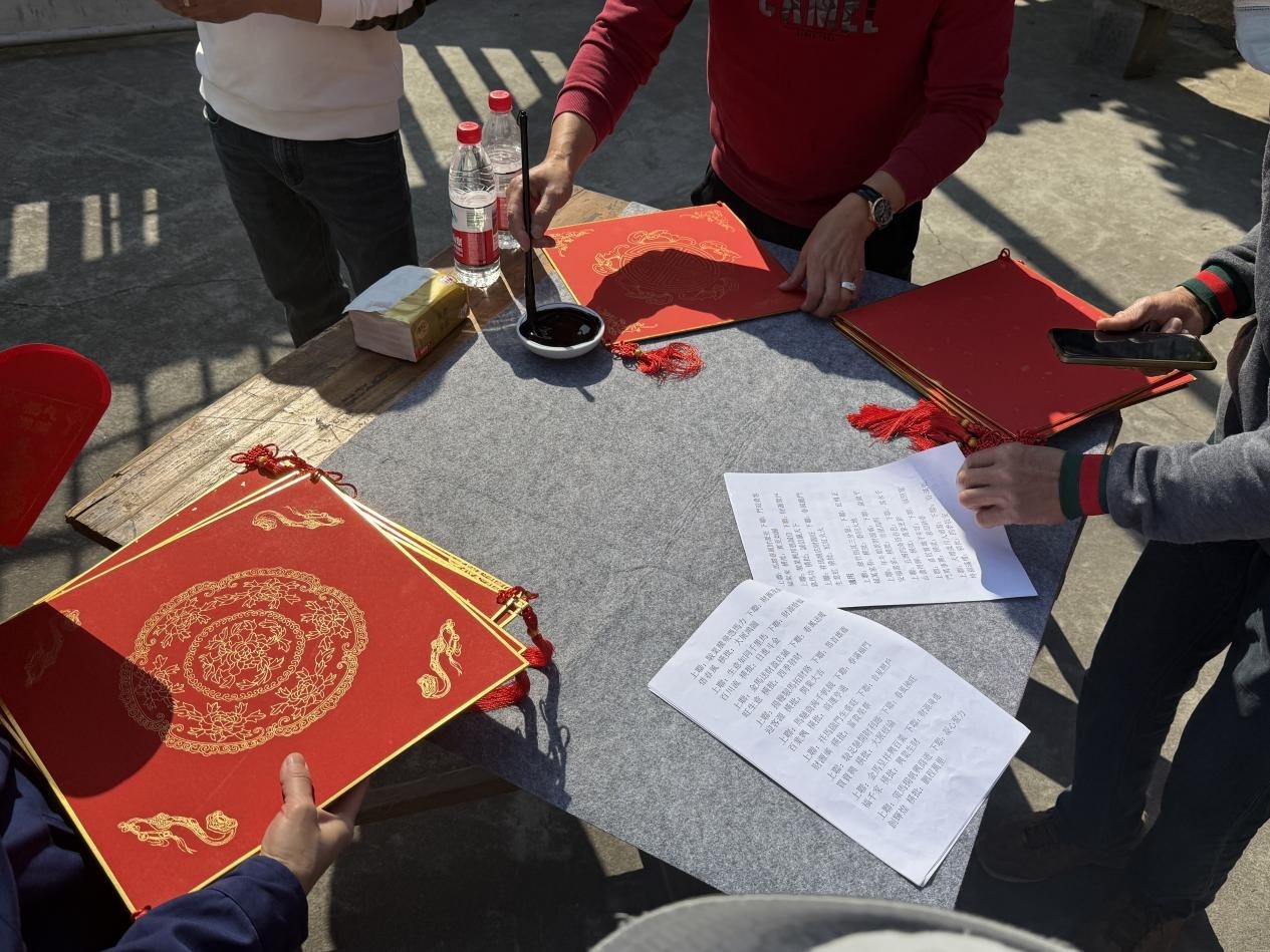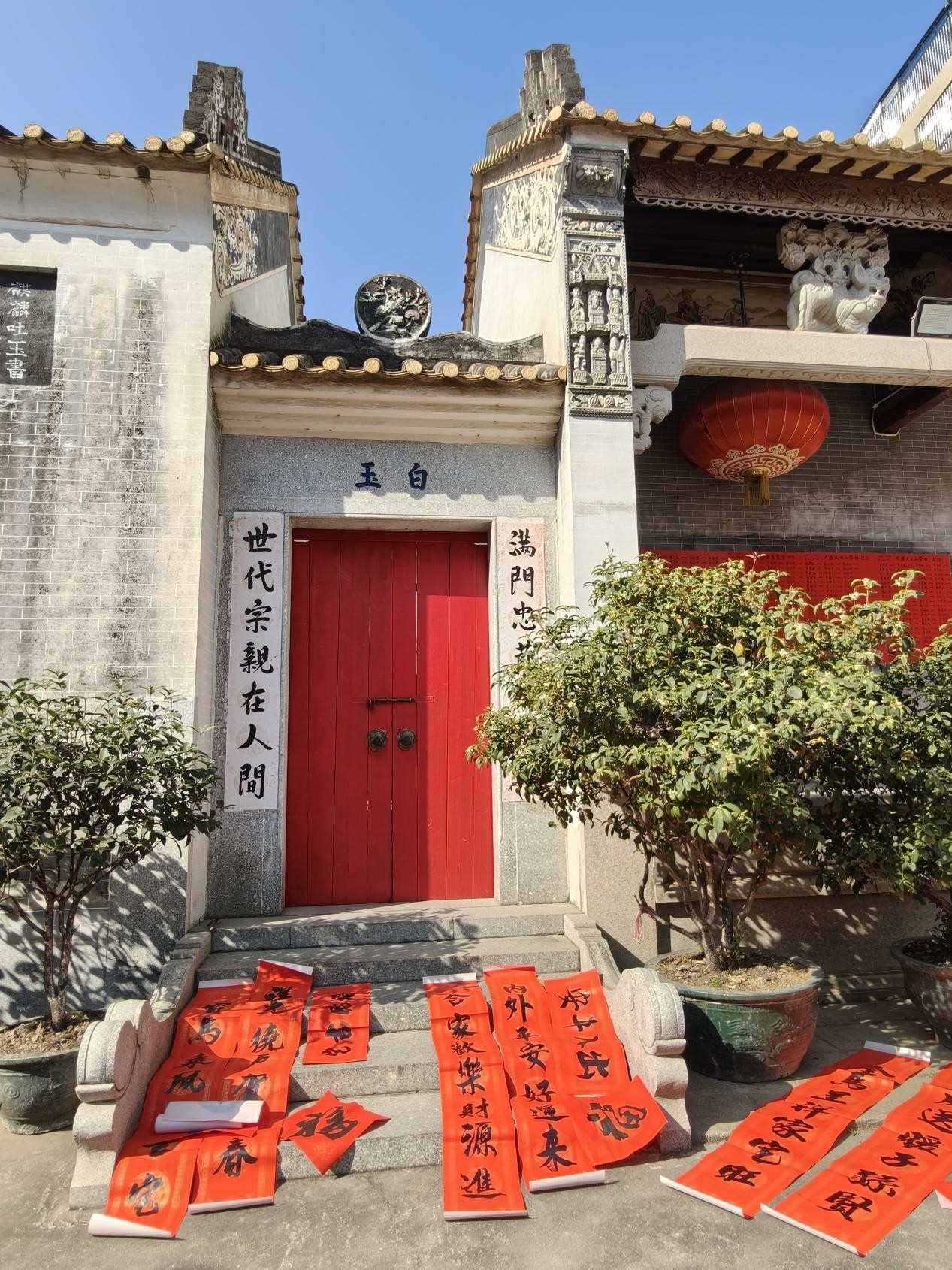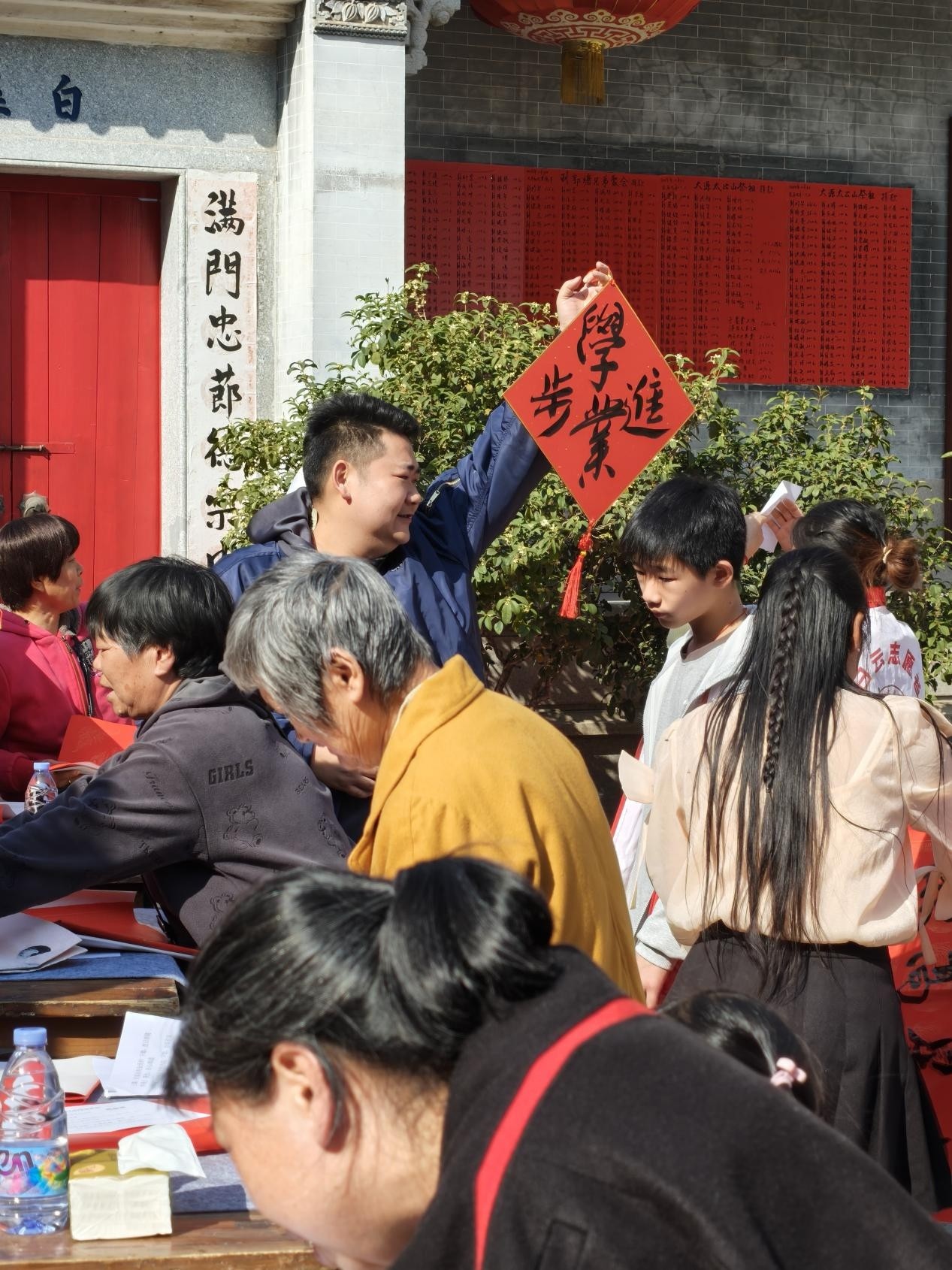 当日下午,活动正式拉开帷幕。彭氏大宗祠前广场彩旗飘扬、人声鼎沸,红彤彤的灯笼与春联素材将现场装点得年味十足。在核心的挥春送福摊位前,早已排起了长队,3位特邀书法老师与全国最美家庭代表黎伟坚女士正凝神挥毫,笔走龙蛇间,一幅幅笔力遒劲、寓意吉祥的春联与福字跃然纸上。“龙腾四海家家乐,马跃九州步步高”“春回大地千山秀,福降人间万户欢”,经典的春联语句承载着对新年的美好期许,定制化的祝福内容则饱含着居民的个性化心愿。拿到春联的居民脸上洋溢着喜悦,不少人当场展开欣赏,互相品评,墨香与欢笑交织成最动人的新春序曲。“在家门口就能领到书法家亲手写的春联,太有意义了!这比买的春联更有温度,贴在家里肯定特别喜庆。”社区居民李阿姨小心翼翼地捧着刚写好的春联,脸上满是幸福。
